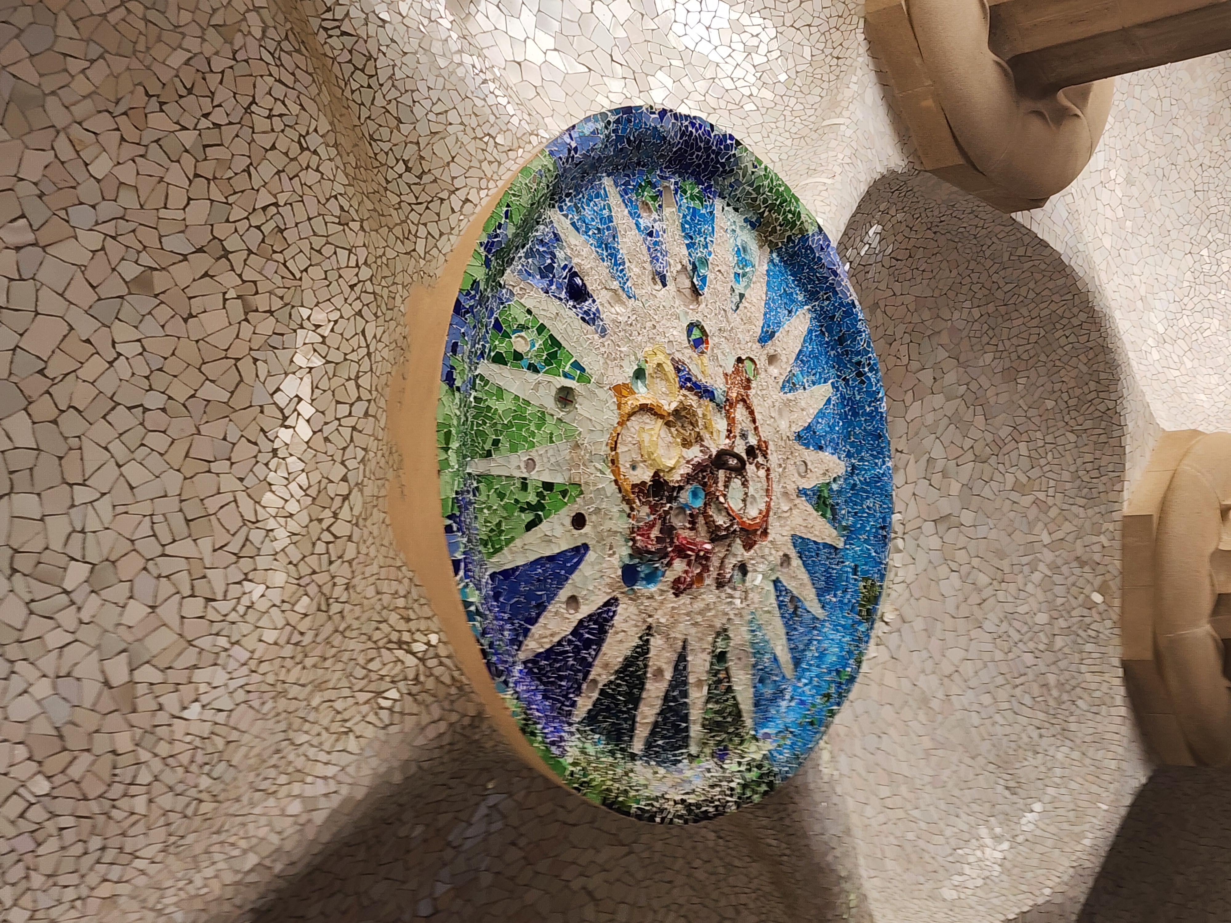 깨진 타일 조각 모자이크 기법(trencadís). 사방으로 뻗친 태양광선 패턴, 가운데는 성화 같은 구상 이미지. 가우디 **바르셀로나 파크 구엘** 하이포스타일룸 천장 메달리온일 가능성 큼